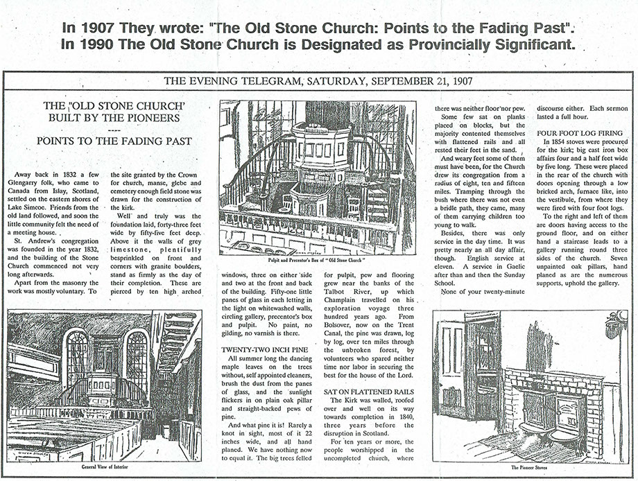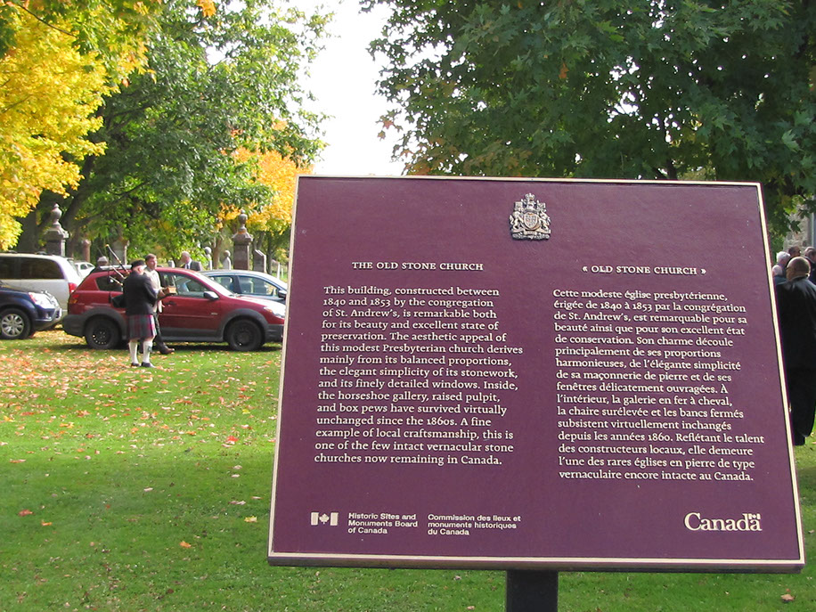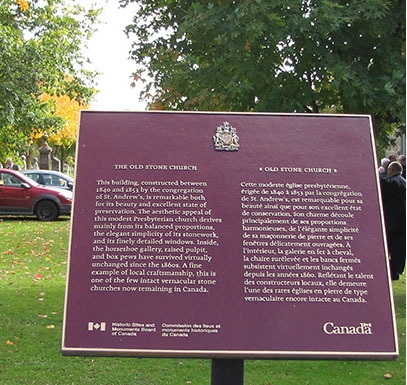 This building, constructed between 1840 and 1853 by the congregation of St. Andrew's, is remarkable both for its beauty and excellent state of preservation. The aesthetic appeal of this modest Presbyterian church derives mainly from its balanced proportions, the elegant simplicity of its stonework, and its finely detailed windows. Inside, the horseshoe gallery, raised pulpit, and box pews have survived virtually unchanged since the 1860s. A fine example of local craftmanship, this is one of the few intact vernacular stone churches now remaining in Canada.
